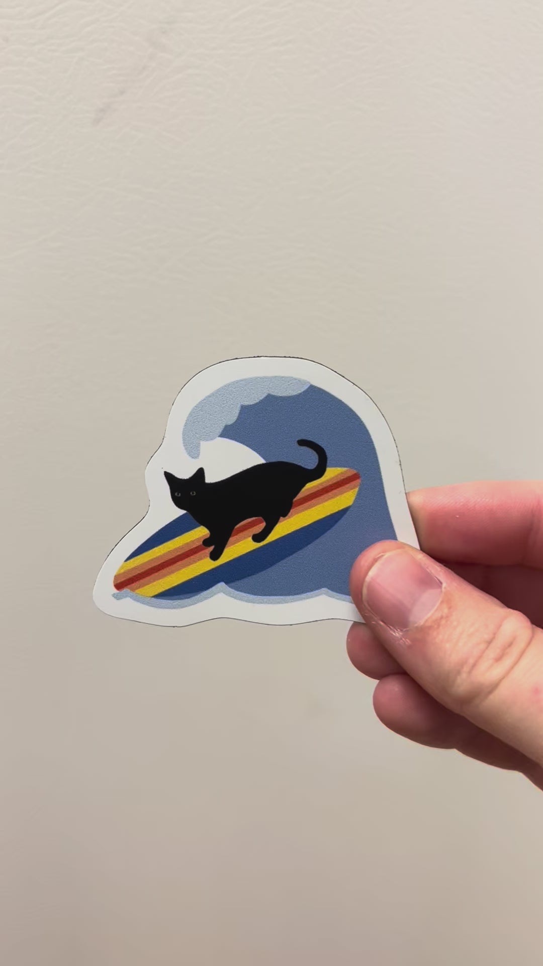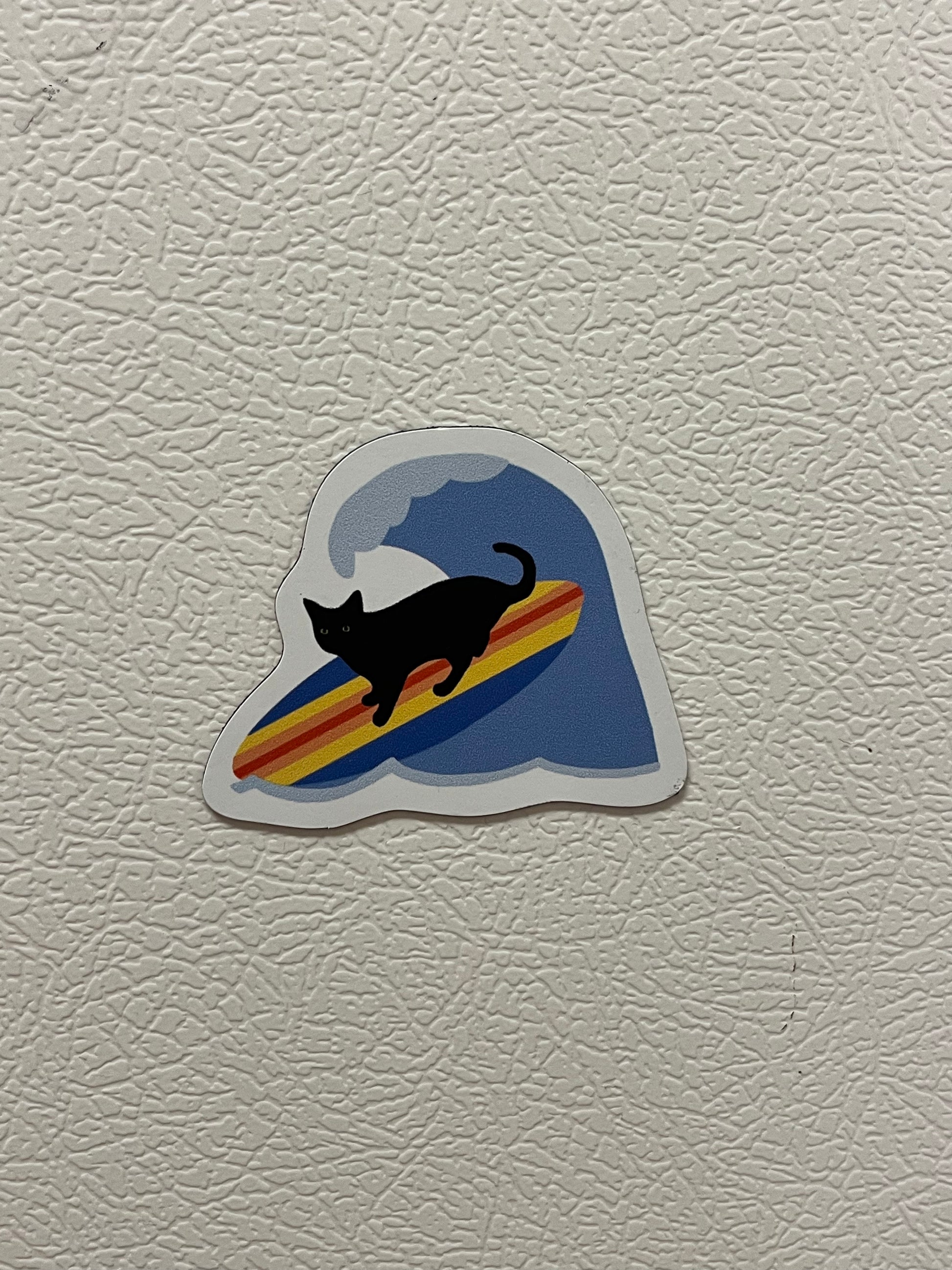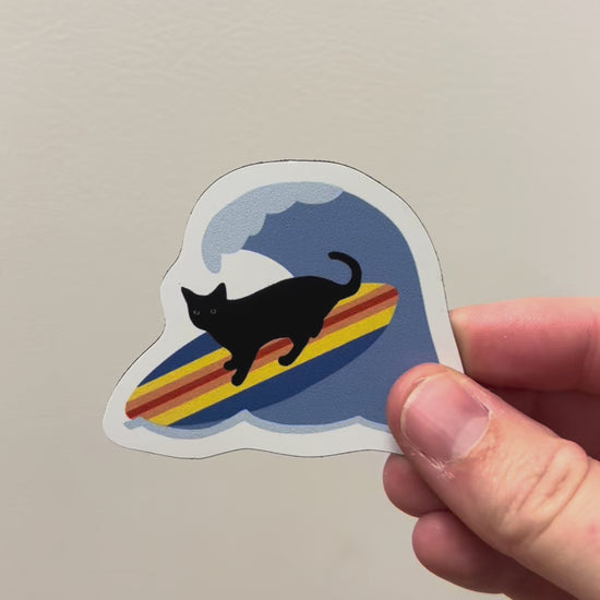 Black cat Bean is hitting the waves! This cool California cat magnet is great for your fridge or other magnetic surface.